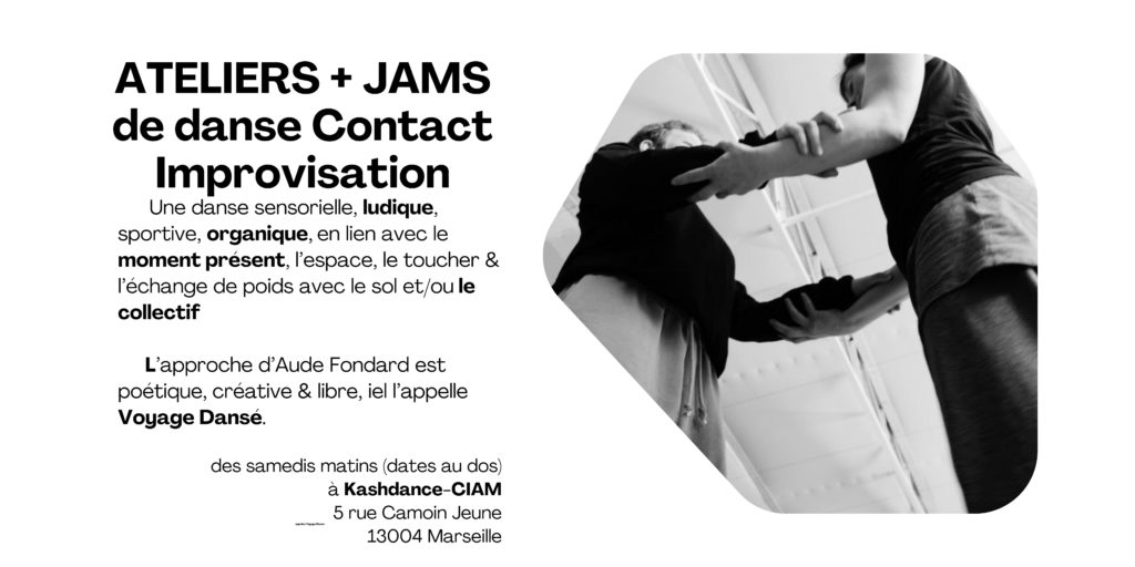 En 2025-26, la jam de Contact Improvisation continue entre 5 avenues et Réformés, dans les locaux de l’association Kashdance-CIAM : 5 rue Camoin-Jeune, 13004 Marseille.