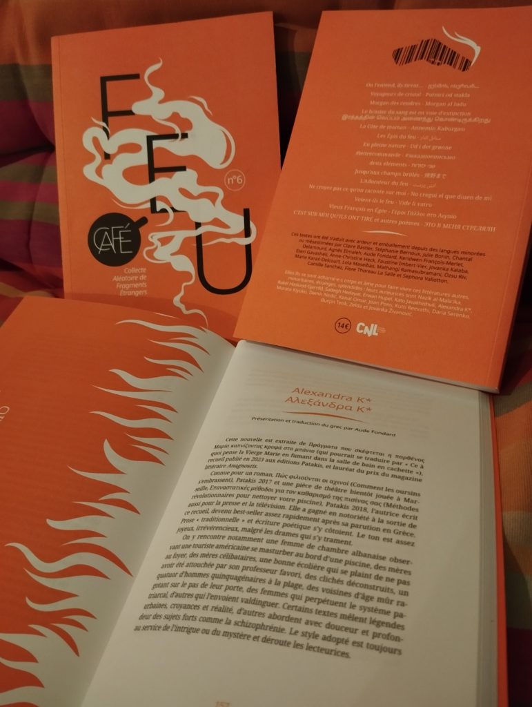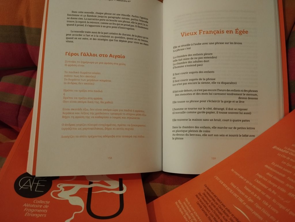 Si mon activité et mon temps dédié au spectacle vivant et à la transmission danse-poésie semblent avoir pris le pas sur le volume horaire consacré à la traduction, je n’ai pour autant pas arrêté. Ma traduction d’une nouvelle d’Alexandra K* « Vieux Français en Egée » sera publiée dans le prochain numéro de la revue CAFE. Cette nouvelle enflammée, déroutante et assez poétique fait partie d’un recueil qui vient d’être nominé pour le Prix littéraire de la revue Anagnostis dans la catégorie Recueil de nouvelles. Bravo Alexandra !