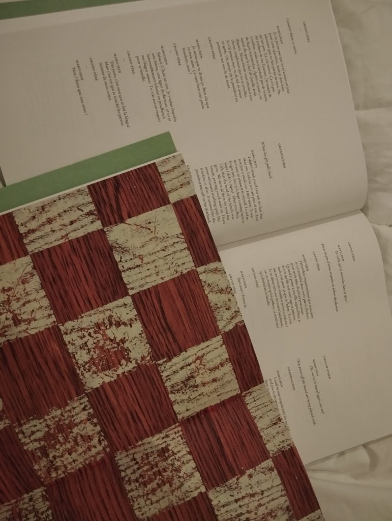 Qu’est-ce que ça implique de traduire du théâtre ? De la langue soi-disant orale, soignée, évocatrice d’une époque, et pourtant universelle. C’est ma deuxième tentative de traduction théâtrale… et je me heurte aux mêmes obstacles. Oralité. Argot. Répétition. En grec, il est d’usage de répéter des mots dans la conversation. Est-ce que je dois m’y tenir ? C’est quoi rendre le débit d’un personnage ? À quel moment la répétition ne fonctionne-t-elle plus sur un plateau français ? Quel degré de vulgarité j’accepte ? Au fil de l’apparition du texte en français, la comédienne en moi se demande, est-ce qu’on dirait ça comme ça ? Comment se jouerait l’affrontement fille-père à la fin ? En quête de réponses, je relis Et le ciel est par terre de Guillaume Poix. Langue épurée. Répétitions martelantes. Oralité poétique.